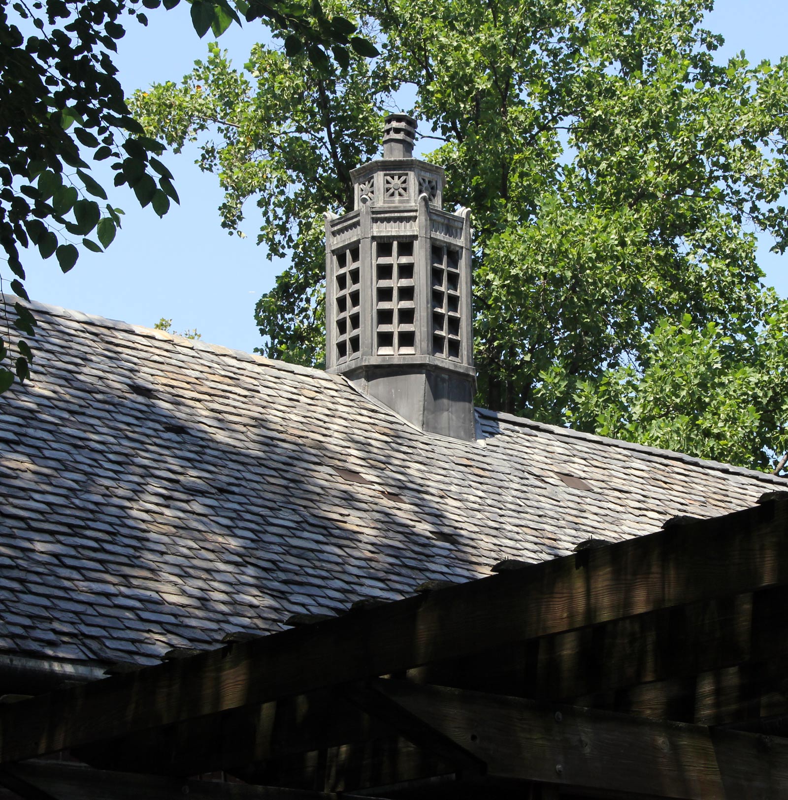 Closeup of 1934 chimney grafted onto a 1980s building at the