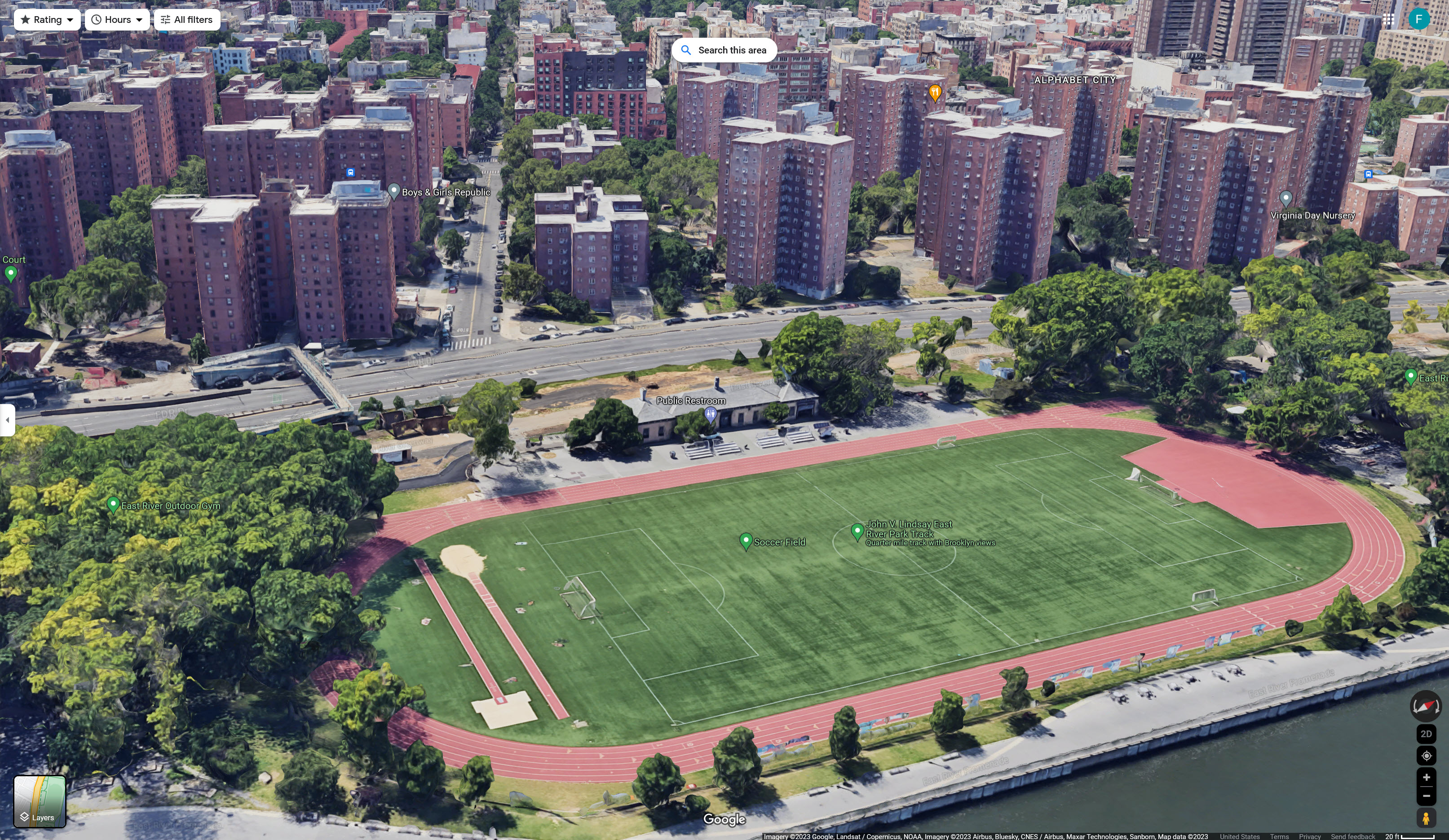 reconstruction of the park. Aymar Embury's track house (labeled "Public Restroom") is seen in the center of the photo, just above the oval running track.