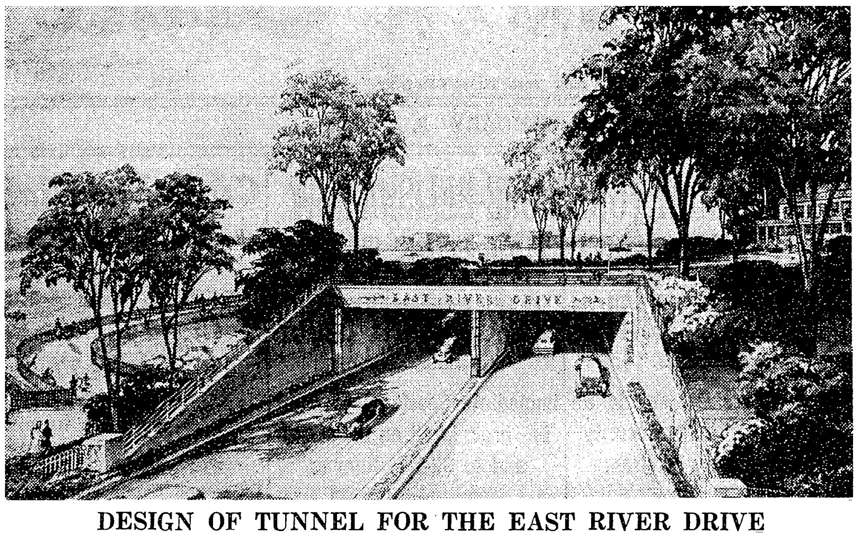 to see the accompanying article, "Design of Tunnel for the East River Drive". Note parkland on left.