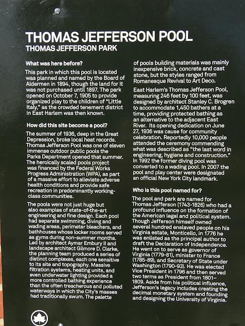 East Harlem's Thomas Jefferson Pool, measuring 246 feet by 100 feet, was designed by architect Stanley C. Brogren to accommodate 1,450 bathers at a time, providing protected bathing as an alternative to the adjacent East River. Its opening dedication on June 27, 1936 was cause for community celebration. Reportedly 10,000 people attended the ceremony commending what was described as "the last word in engineering, hygiene and construction." In 1992, the former diving pool was converted to a wading pool. In 2007, the pool and play center were designated an official New York City landmark.