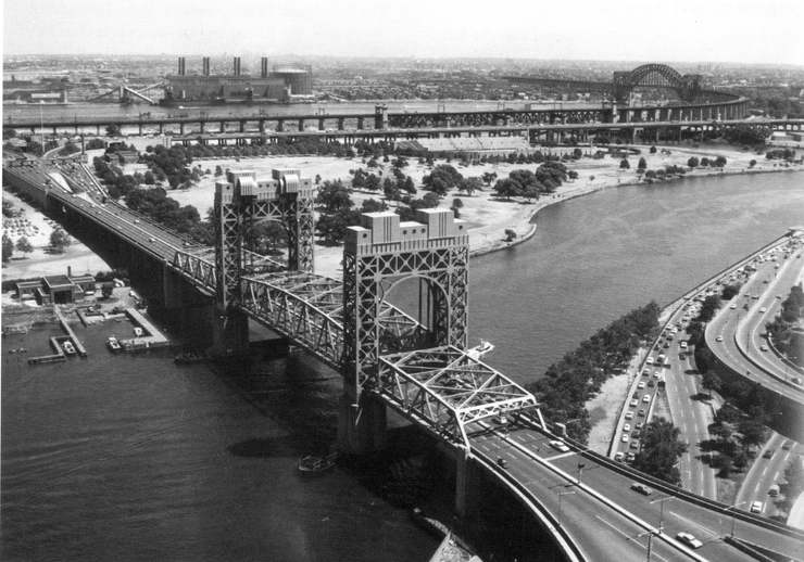 Triborough Bridge, lift span between Randalls Island (left) and Manhattan (right), July 1, 1965. Queens is visible in the distance.