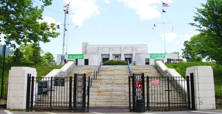 ironwork, steps, flagpoles, and the building itself as well as the trees